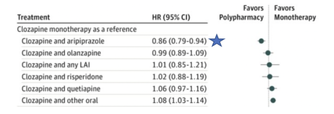Although evidence supporting this strategy is limited, (Chiu et al., 2020), Tiihonen and colleagues (2019) conducted a large cohort study following over 62,000 patients for 20 years and found that patients treated with a combination of clozapine and aripiprazole had a 14% lower risk of psychiatric hospitalization compared to those on clozapine monotherapy, and that this combination was associated with the lowest hospitalization rates among all tested. However, combinations of clozapine with other antipsychotics did not significantly reduce hospitalization rates compared to clozapine alone.