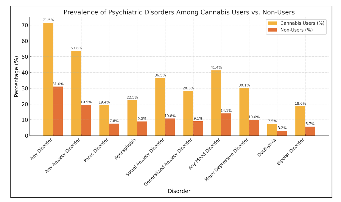 Figure 1: Prevalence of psychiatric disorders among cannabis users compared to non-users. This figure highlights the percentage of individuals diagnosed with various psychiatric disorders within the past year, comparing cannabis users and non-users. Disorders include broad categories like "Any Disorder," "Any Anxiety Disorder," and "Any Mood Disorder," as well as specific subtypes such as panic disorder, social anxiety disorder, and bipolar disorder. Data adapted from Cannabis Use and Risk of Psychiatric Disorders Prospective Evidence From a US National Longitudinal Study (Blanco et al., 2016).